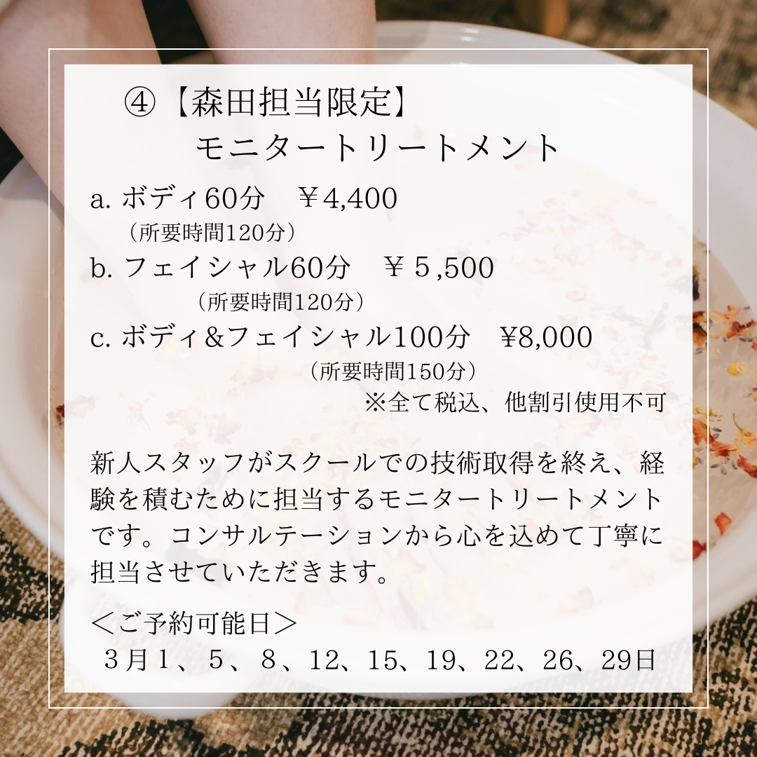 【ご予約ページ 森田担当モニターボディ、森田担当モニターフェイシャル、森田担当モニターボディ&フェイシャル】